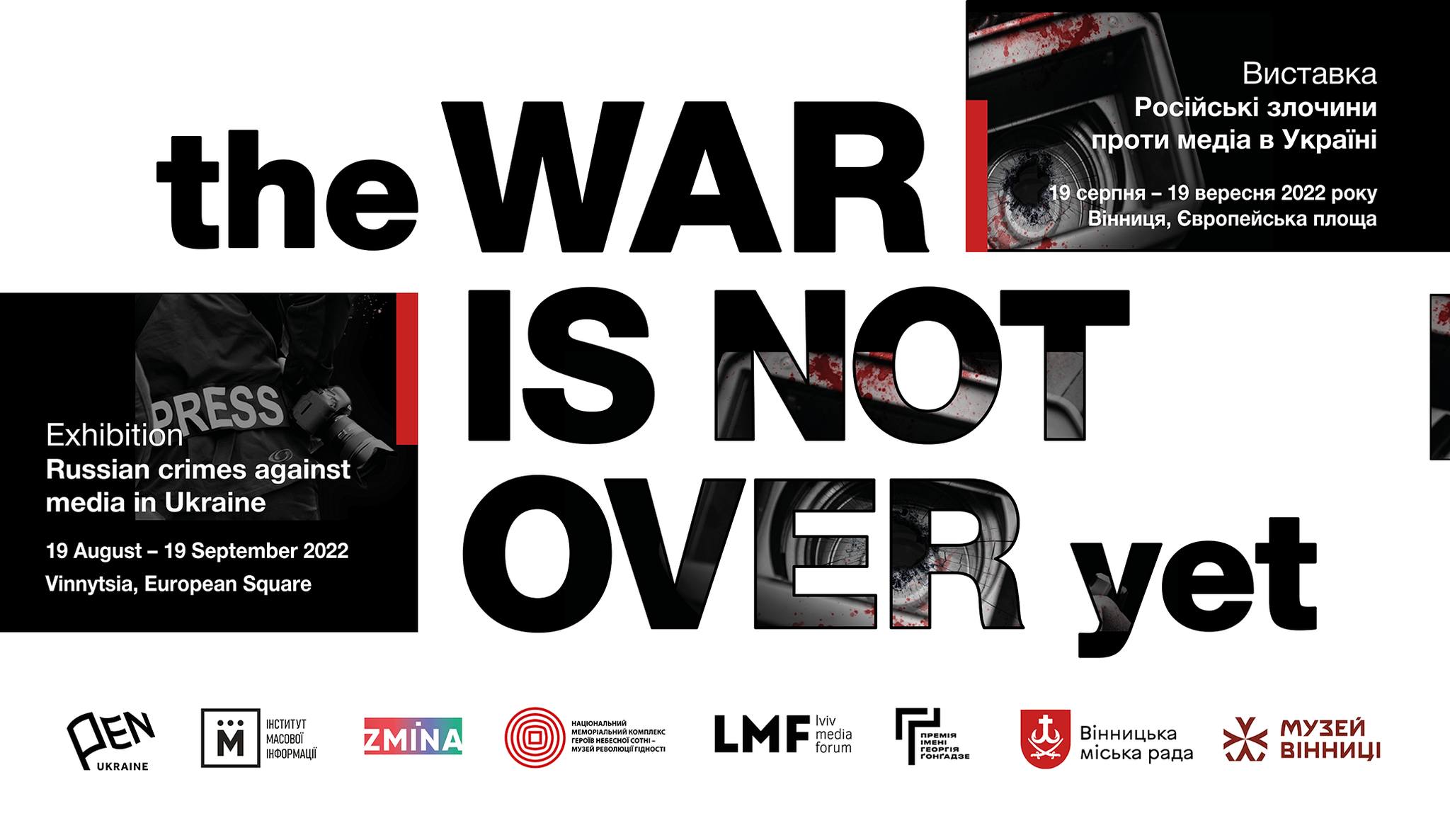 Виставка The War Is Not Over Yet – вияв солідарності з українськими медійниками та медійницями, які борються за правду, ризикуючи власним життям. Вони залишають свою професійну діяльність і стають до лав Збройних сил України. Вони ведуть активну боротьбу на інформаційному фронті, фіксуючи хід війни і розповідаючи про неї правду світові. Завдяки українським журналістам, фотографам, операторам та фіксерам міжнародна спільнота дізнається про новини з фронту й бачить докази воєнних злочинів росіян.